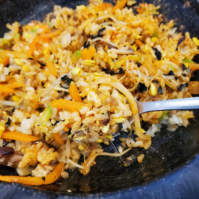 야채와 고기 계란까지 영양적인 면에서도 골고루 잘 조합이 된 색감이 예쁜 돌판비빔밥이 나왔다. 밑반찬 세팅 시 같이 제공된 고추장을 넣어 함께 비빈 후 한 입 넣으니 온기한그릇의 돌판비빔밥은 고소함이 입안으로 쫙 퍼져서 좋았다. 돌판에 재료들을 얹어 따끈따끈하게 밥을 먹을 수도 있어 좋았고, 한 그릇 다 먹을 때까지 고소함이 끝까지 있었다.