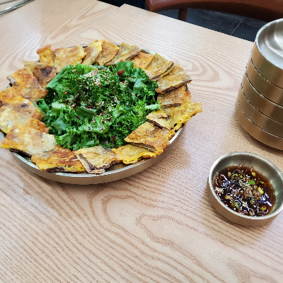 완도 톳밥 정식과 추가로 고등어구이와 소고기 육전을 주문했다. 생수도 제공되지만 따뜻한 보리차도 있어서 뜨끈하게 보리차 한잔을 마시고 있으니 소고기육전이 젤 먼저 나왔고 모두가 비주얼에 환호했다. 소고기를 좋아하지 않아 평소 집에서 해주는 육전도 잘 안 먹는데 (엄마 미안) 너도 나도 젓가락질을 하여 나도 한 입 먹어봤더니 세상에! 고기 잡내도 없고 너무 고소하다...! 치커리 무침과도 잘 어울리니 산내향에 방문하시면 소고기 육전도 추가로 드셔보시기를~