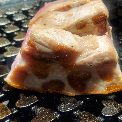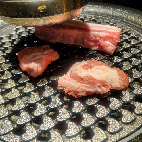 꽃목살과 삼겹살을 주문했다. 고기를 잘 볼 줄은 모르나 선홍빛을 띠며 싱싱한 상태로 보여 좋았고 하트모양의 불판이 특이했다. 구워가는 중 삼겹살을 보니 하트모양이 그대로..! 고기에 찍혀서 특이해 잠깐 미소를 짓게 했다.