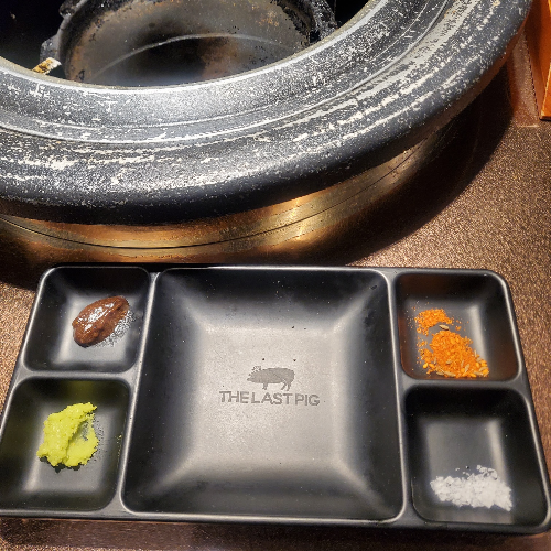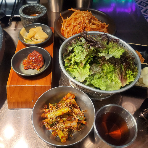 생수 대신 헛개나무차를 제공하는 점이 좋았고 (나는 생수보다 보리차나 그 외 다른 차 종류를 주는 곳을 좋아한다..) 콩나물 무침 및 파무침, 멜젓, 그 외 다른 야채도 푸짐하게 제공해 줘서 좋았다. 고기를 찍어먹는 소스 또한 여러 가지 주었는데 양꼬치에 찍어먹는 향신료는 안 주셨으면 좋았을 것 같다. 개인적으로 이 향에 굉장히 예민해서 고기 먹을 때 소스를 안 찍어도 향기가 계속 올라와 속이 안 좋았다..