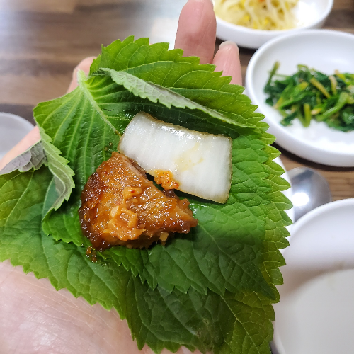 뼈에 붙은 살을 발라내고 본격적으로 음식을 먹어본다. 밑반찬은 양파장과 상추, 깻잎 콩나물무침, 시금치무침 등이 제공되고 처음에는 가져다주시지만 이후에는 셀프로 가져다 먹으면 된다.