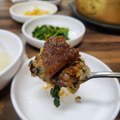 고기를 먹었을 때 매운맛을 좋아하는 나는 하나도 맵지 않았고 같이 간 친구들은 조금 매운맛도 매콤하다고 했다. 돼지갈비찜이니 고기에 대한 맛을 이야기해 보자면 육향에 굉장히 예민한 나는 고기만 먹었을 때 돼지고기 잡내가 느껴져 속으로는 살짝 실망했다. (고기 잡내에 대한 평가는 각자 다를 수 있다. 다른 사람들이 못 느끼는 고기잡내를 나는 정말 예민하게 느끼는 것 같다.) 그래서 깻잎과 상추와 함께 먹으니 달달하고 매콤한 고기의 맛을 그때부터 충분히 느끼고 맛있게 먹을 수 있었다.
