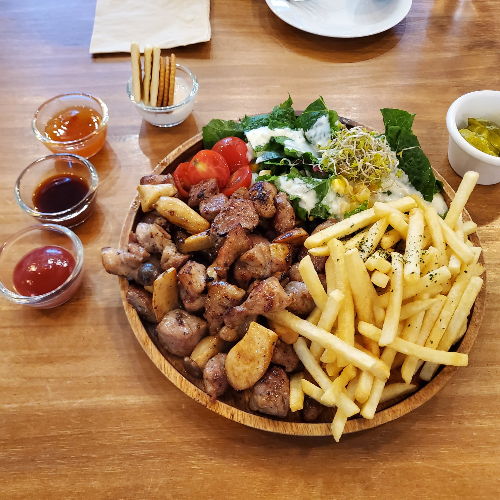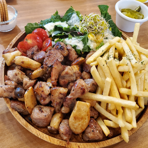샐러드와 목살 버섯, 감자튀김으로 구성된 목살플레이트는 15,500원이라는 가격 답지 않게 푸짐하게 나온다. 이 양과 구성으로 다른 곳에서 목살플레이트를 먹는다면 최소 3~4천 원은 더 비싸지 않았을까. 감자튀김이 웬만한 패스트푸드점보다 잘 튀겼으며 짜지 않아서 맛있었고 고기는 같이 간 친구는 맛있게 먹었지만 다른 사람들보다 육향에 민감한 나는 잡내가 조금 느껴져 한 번 먹어본 것으로 만족한다.