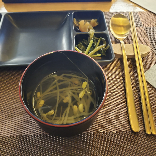 돼지고기를 먹기 전 시원한 물과 와사비, 말돈소금, 명이나물장아찌, 궁채장아찌, 콩나물국이 제공된다. 수저마저도 정갈하다. 밑반찬은 먼저 얘기하지 않아도 필요한 밑반찬을 캐치하고 채워주셔서 좋았다. 오픈형 주방으로 내가 먹을 요리를 직접 볼 수 있다는 점이 좋았다. 요리가 하나씩 등장하면 상단 선반 위에 요리를 놓아주며 음식을 가져가서 먹고 다 먹은 접시는 올려놓으면 되는 방식이었다.