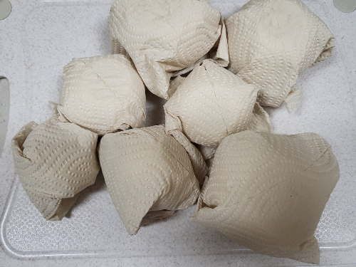 껍질을 깐 양파는 세척을 하지 않고 키친타올로 한 개씩 다 감싸준다. 세척을 하고 난 후 물기를 잘 닦지 않아 물기가 있는 상태에서 감싸면 상하기 쉬워 오래 보관할 수 없어 먹을 때마다 세척하기 위해 바로 다 감쌌다.