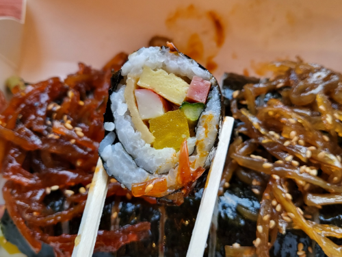 밥은 촉촉하게 진밥의 느낌이 강했고 단무지, 오이, 햄, 계란, 맛살, 어묵이 들어간 집에서 싼 듯한 집밥느낌이 나는 기본 김밥이었다. 개인적으로는 김밥에 들어있는 밥은 된밥보다는 촉촉한 느낌의 밥을 더 좋아해서 부드러운 느낌으로 먹을 수 있어 좋았고,