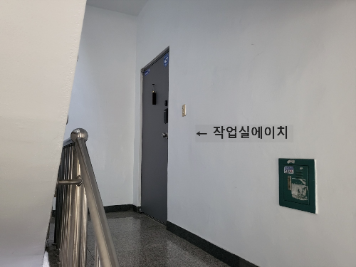 평리2동행정복지센터 버스정류장 옆 골목에 들어가서 바로 보이는 빌딩 건물을 보면 작업실에이치 입구이다.