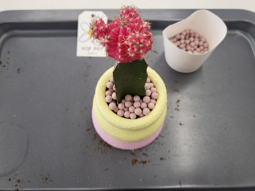 나는 핑크와 빨강이 오묘하게 섞인듯한 선인장을 선택했다. 흙을 넣어가며 식물을 심어준 후 자갈까지 고슬고슬 뿌려주면 힙팟 화분 어느덧 완성!!