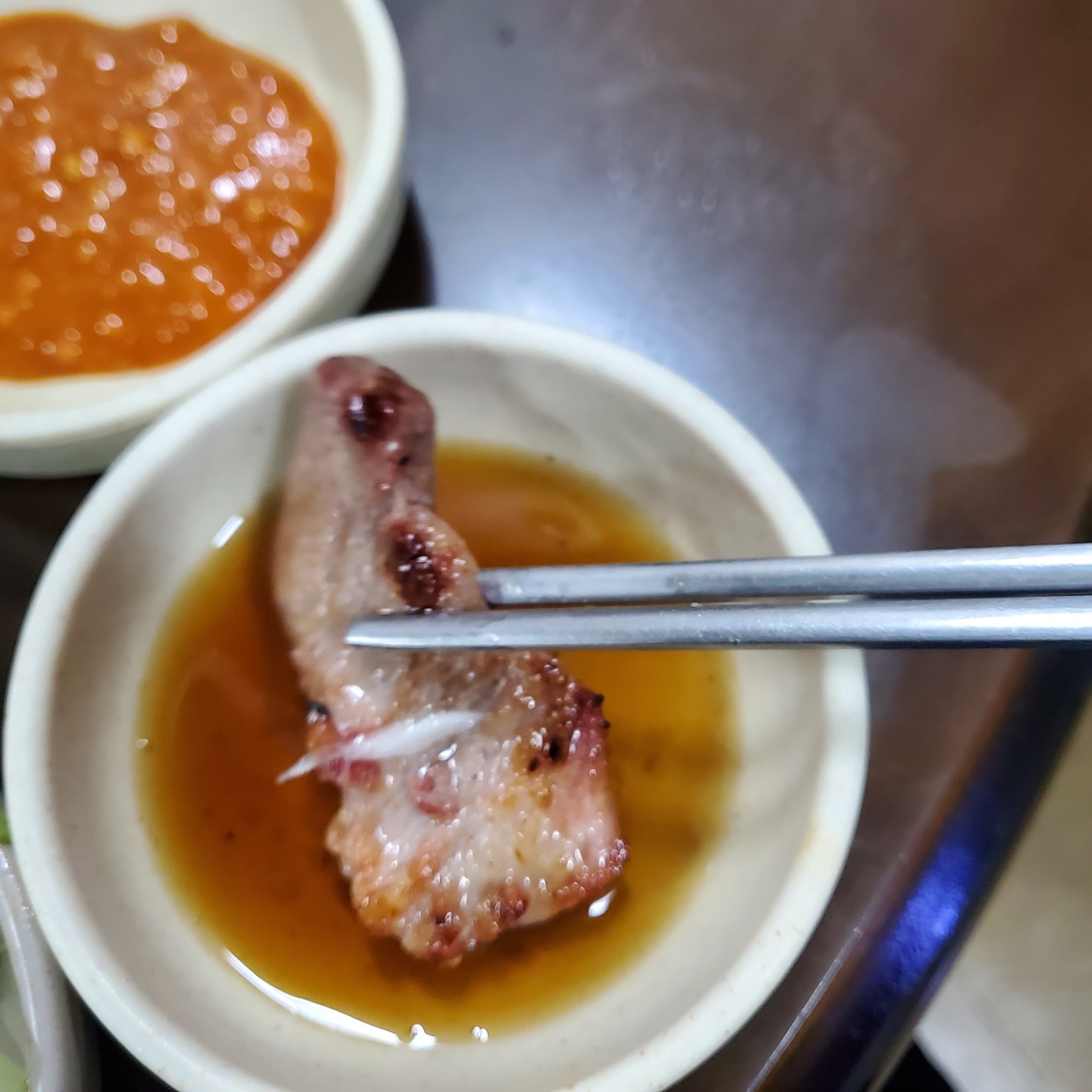 선홍빛 색깔의 고기가 점점 갈색으로 변화되면서 맛있게 고기가 구워졌다. 단골 고객님이신 같이 온 일행분께서 먼저 고기만 먹어보기를 추천하셨다. 양념장에 살짝 고기만 찍어서 먹었는데 와... 잡내가 아예 없었다.