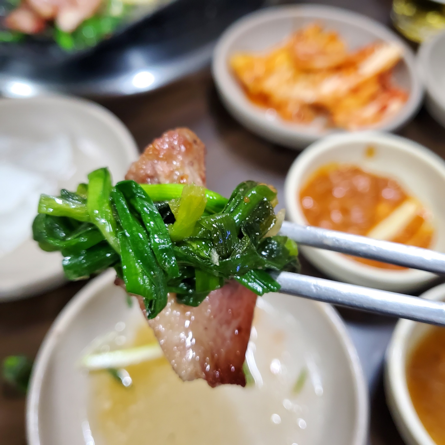부추와 뒷고기가 함께 나오니 고기위에 부추도 올려서 먹어봐야겠다. 돼지기름을 적절히 머금은 부추와 부드러운 고기의 맛이 아주 잘 어울렸다. 뒷고기는 쫄깃쫄깃한 느낌이 강했다면 함박살 뒷고기는 같은 계열이지만? 조금 더 부드러운 느낌이 강한 고기였다. 쫄깃한맛과 부드러운맛을 함께 갖고 있는 고기였다.