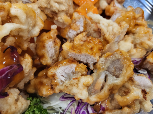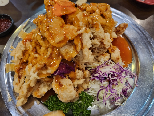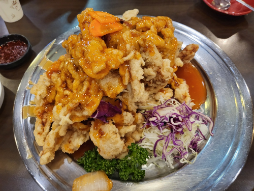 리안의 탕수육 대 사이즈의 양이다. 꿔바로우 스타일의 찹쌀탕수육으로 겉은 바삭하고 속은 찹쌀 때문에 쫀득한 맛도 난다.