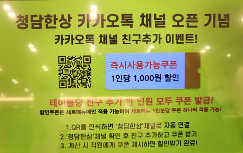 청담한상 카카오톡 채널 오픈 기념 친구 추가 시 즉시 사용가능한 1,000원 할인쿠폰 제공 (인 당 가능함)