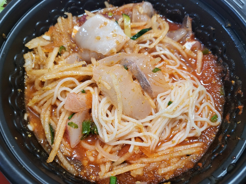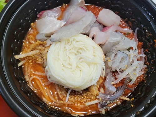 물회맛집은 포항에만 있는 줄 알았는데 대구에도 있었다!! 살짝 녹은 육수에 소면을 넣고 구매한 회를 더 넣어 젓가락으로 슥슥- 비볐다.