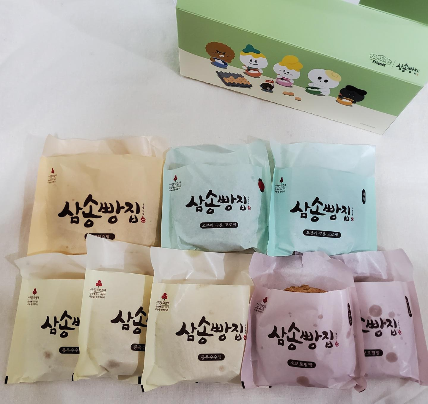 처음에 동생이 박스하나를 들고 들어오기에 포장박스가 너무 귀여워 눈길이 갔다. 그런데 알고보니 삼송빵집 제품박스 라니! 전에는 이렇게 예쁜 포장박스는 아니였던 것 같은데 받아보니 캐릭터들이 너무 귀엽다. 포장박스 앞에 있는 캐릭터는 로케,모모찌, 아리 등 캐릭터마다 이름도 있다. 소비자들에게 더욱 친근감있게 다가가려는 삼송빵집의 노력이 보인다.