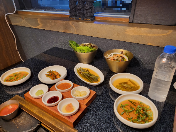 고기가 나오기 전 내부 인테리어나 밑반찬 세팅의 느낌은 깔끔하다였다. 고기를 찍어먹는 다양한 소스부터 명이나물, 궁채장아찌, 상추재래기, 쌈채소가 나왔다.