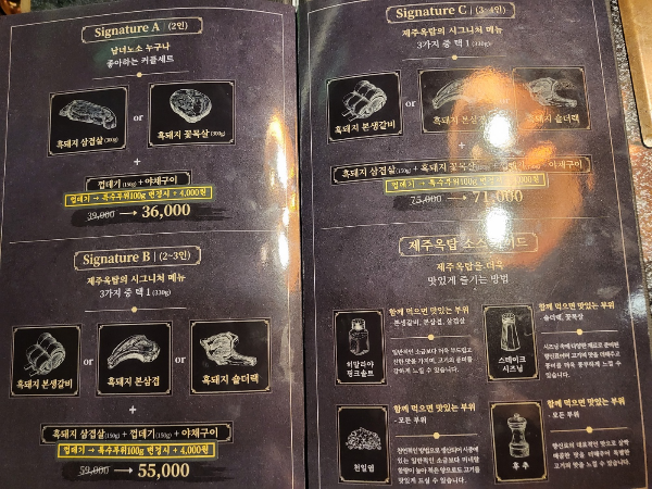 제주산 흑돼지는 세트메뉴부터 단품까지 선택가능하며 딱새우 된장찌개, 흑돼지 김치찌개, 게장 비빔밥 등 식사메뉴도 판매되고 있다.