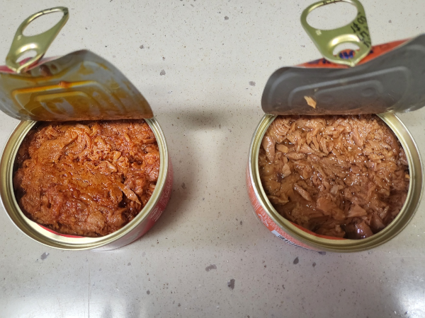 캔 뚜껑을 열어보았다. 왼쪽은 매콤참기름, 오른쪽은 고소참기름이다. 양은 90g으로 한 끼에 먹기 딱 좋은 사이즈이다.