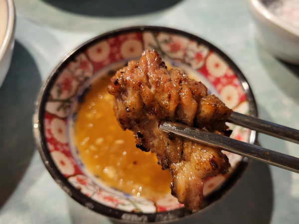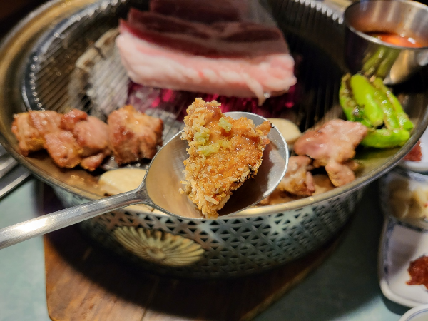 목살 2인분과 삼겹살 2인분을 주문했고 직원이 고기를 맛있게 구워주시며 익힘 정도는 괜찮은지 확인한 후 먼저 소금에 찍어먹어 보기를 권유한다.