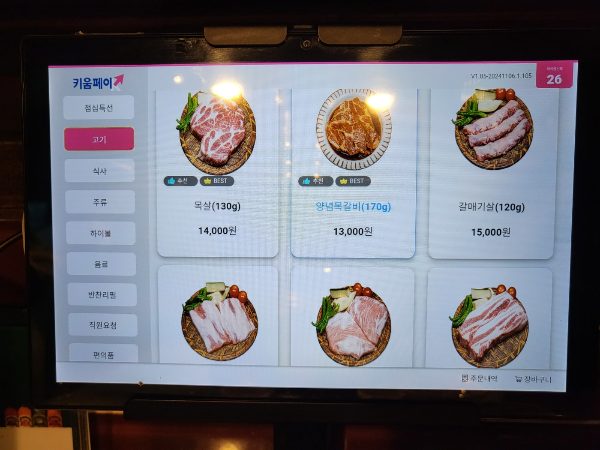 내가 처음에 가려고 했던 식당은 150g 10,500원 그다음 식당이 150g에 14,000원이었던 것을 알고 나면 이곳이 비싸게 느껴졌으나 맛은 일단 먹어봐야 알 수 있으니 기대감을 가져보고 키오스크로 주문을 해본다.