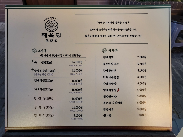 1층과 2층으로 이루어진 혜옥당은 깔끔한 인테리어로 먼저 시선을 사로잡는데 저녁에 방문하니 은은한 조명이 있는 곳이라 분위기 있게 고기를 먹을 수 있다. 이곳도 직원이 고기를 구워주는 편리한 시스템이 있다.