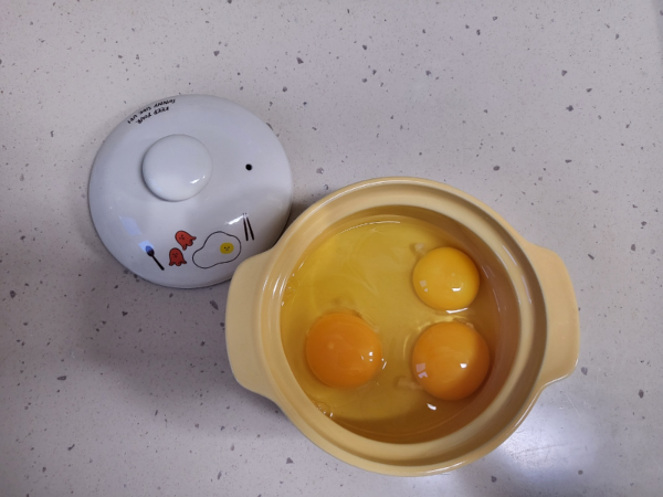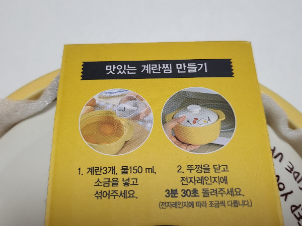 설명에 적힌 대로 계란 3개와 물 150ml, 소금을 넣고 섞어 뚜껑을 닫고 전자레인지에 넣었다.