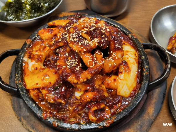 색깔부터 입맛을 자극시키는 낙지볶음이 나왔다. 돌판 위에 올려져 나와 따끈하게 먹을 수 있는 장점이 있으며 낙지는 통으로 나오니 먹기 좋게 잘라서 드시면 된다.