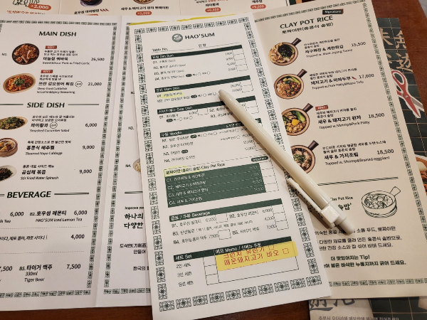 호우섬은 선결제 진행 매장으로 메뉴판을 보며 메뉴를 선택한 뒤, 식탁 옆에 비치된 주문종이에 메뉴를 체크한 후