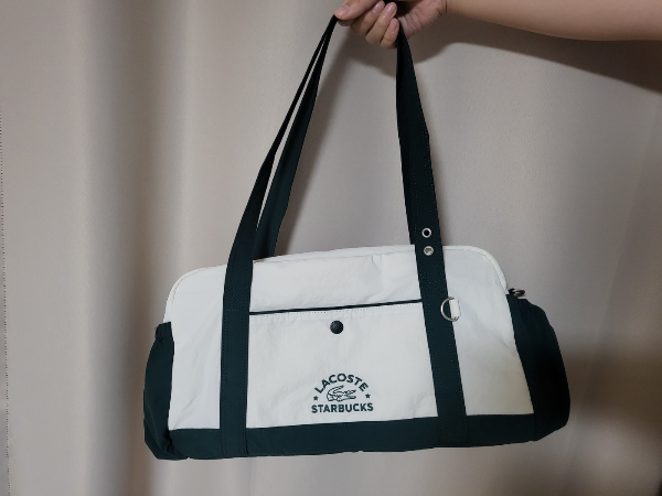 여행할 때 캐리어에 끼워서 사용할 수 있도록 후면밴드도 있으며 밴드 지퍼를 열어 소지품을 보관할 수도 있다. 실물로 보니 생각했던 것보다 장점이 많은 가방이었고 스타벅스와 라코스테의 만남이 특별했다고 생각한다.