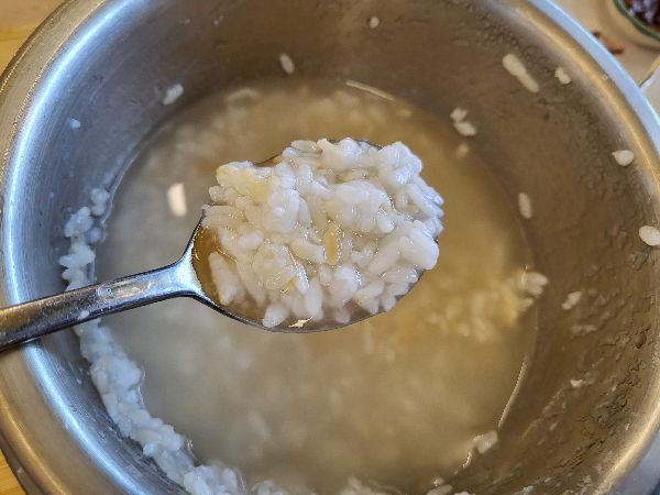 병아리콩과 완두콩이 들어간 따끈하게 갓 지어진 밥에 바삭하게 잘 구워진 생선구이 올려서 한 입, 숭늉으로 마지막 입가심까지 하니 좋은 가격에 맛있는 생선구이를 먹었다는 만족감이 들었으며,