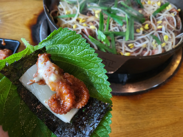 쭈꾸미를 소스에 찍은 후 깻잎 한 장, 김 한 장, 백김치 하나를 올려 삼합으로 먹는 것이 내 입맛에는 제일 맛있게 느껴진다.