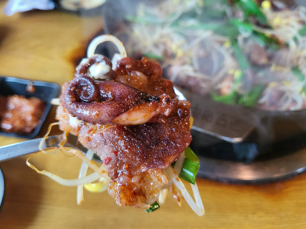 부드럽고 탱글한 맛이 공존하는 쭈꾸미의 맛. 삼합으로 먹어도 맛있고 차돌박이 위에 쭈꾸미를 함께 올려먹어도 맛있다.