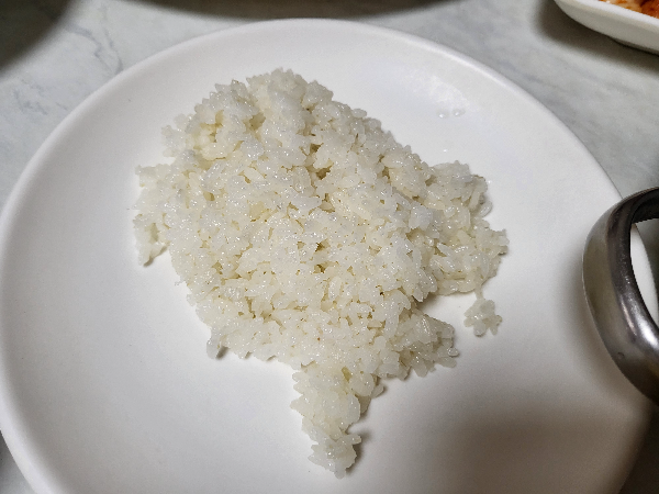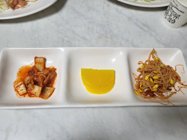 돈까스를 먹기 전 수프와, 함께 곁들여 먹을 밥과 장국, 김치, 단무지, 콩나물 무침이 나왔다. 수프는 밍밍한 맛이 나서 아쉬웠고 돈까스와 콩나물 무침을 함께 먹으면 맛있는데 양이 적어 더 달라고 요청해야 되는 점이 불편하게 느껴져 인원수에 따라 좀 더 넉넉한 양으로 주셨으면 좋겠다.