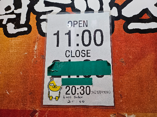 오전 11시에 오픈하여 오후 8시 30분에 문을 닫으며 평일에는 오후 4시에서 5시까지 브레이크타임이 있다.