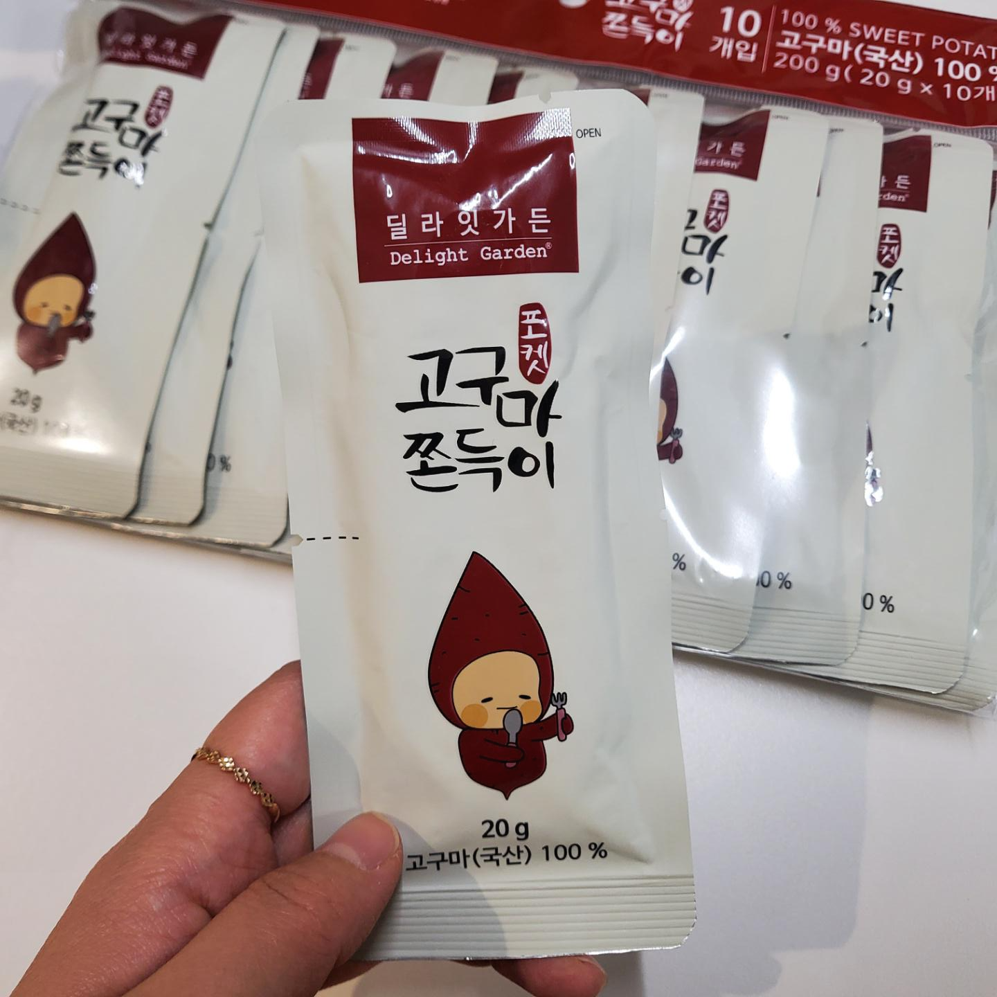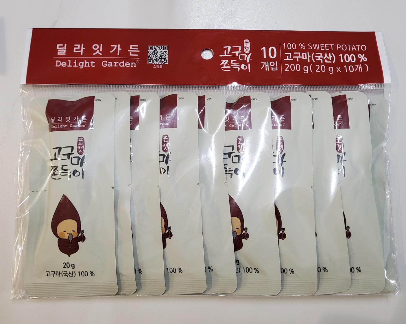 쿠팡에서 행사가로 8,360원에 구매한 딜라잇가든 고구마쫀득이다. 딜라잇가든은 2013년부터 과일 원물 등을 소재로 제품을 생산하고 있는곳이라고 한다. 10개로 소포장된 제품들이 들어있었으며 국내산 고구마로 만든 고구마스틱이라고 한다.