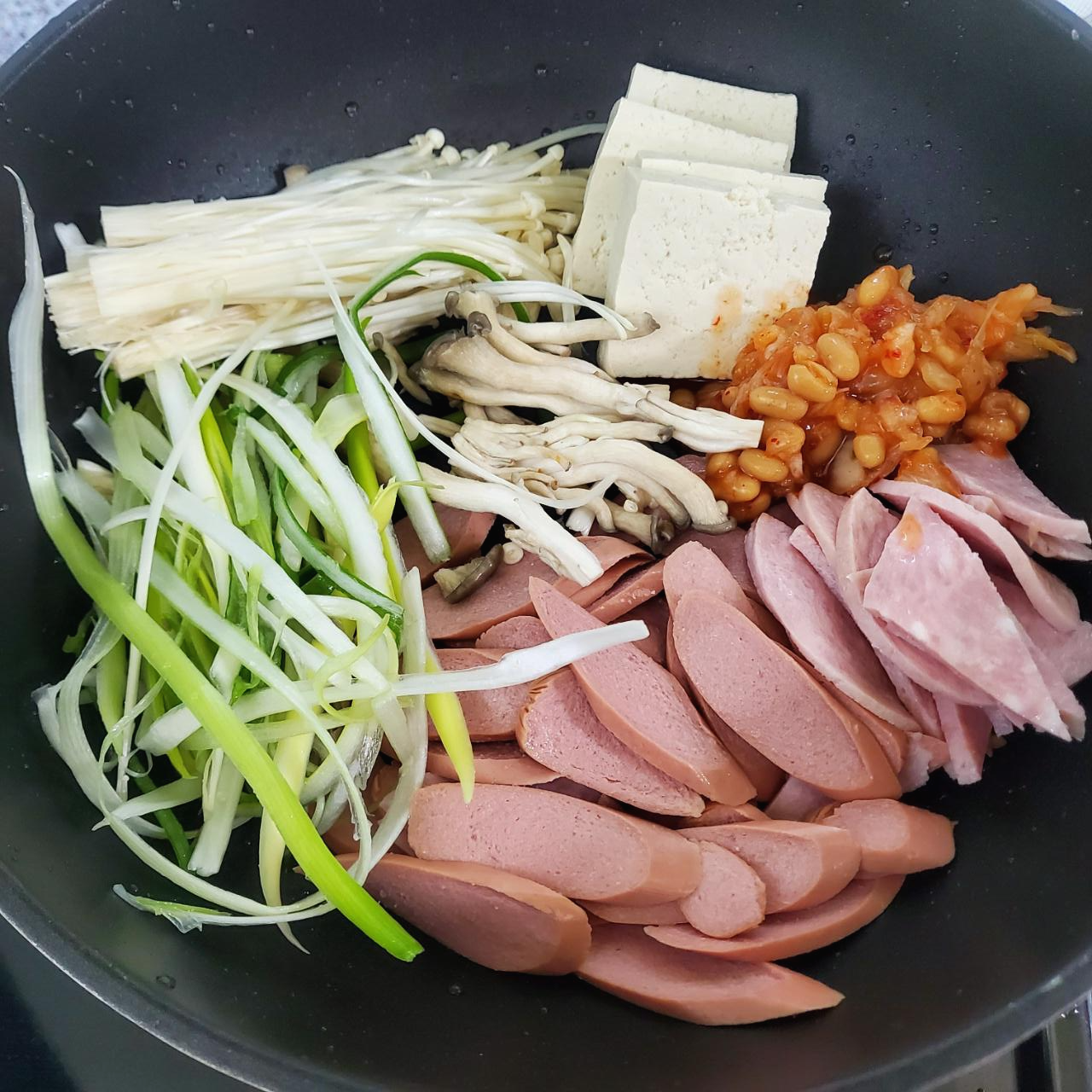 1. 햄, 야채, 두부, 콩 등을 모두 냄비에 넣는다.