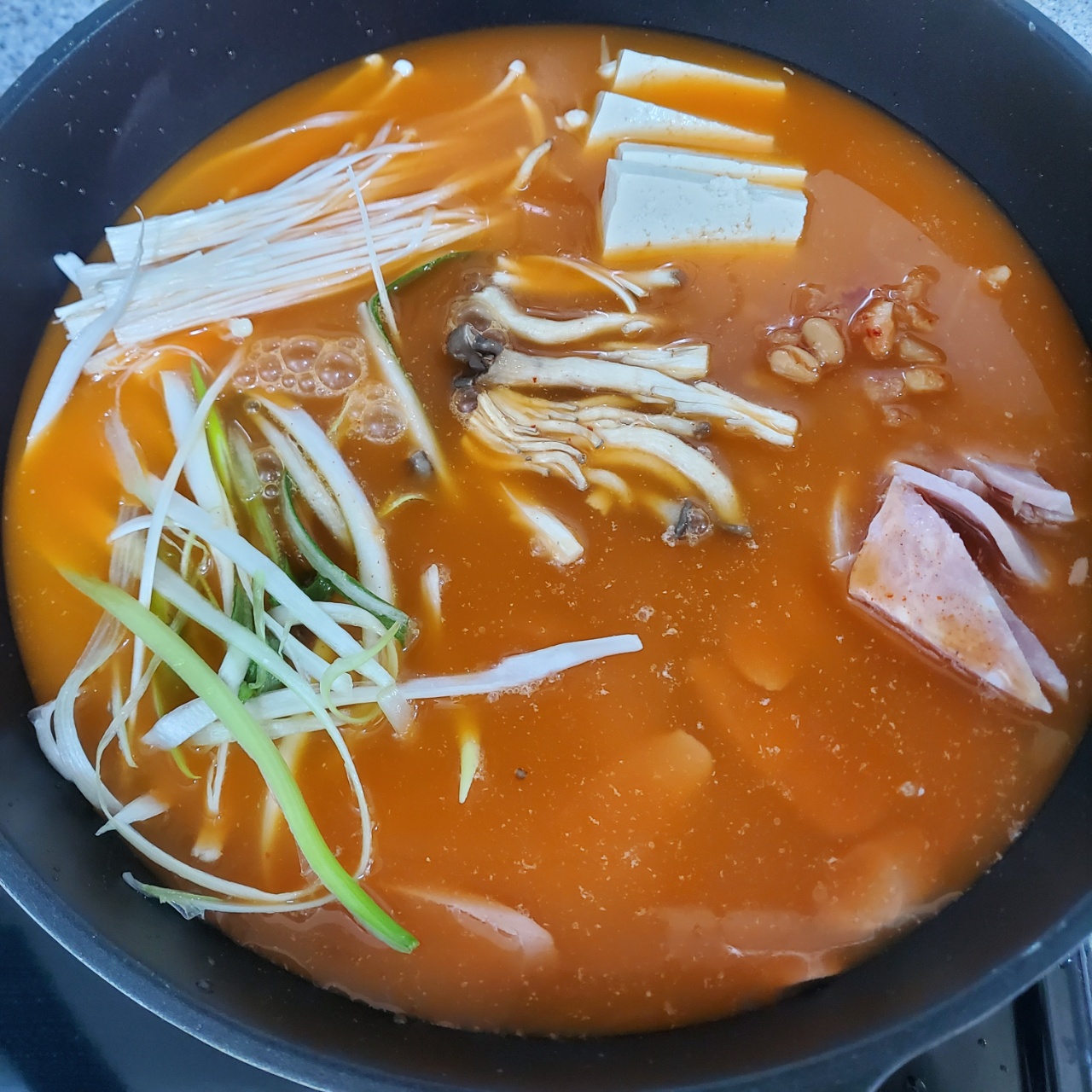 3. 5분 정도 끓인 후 라면, 당면, 떡을 넣고 5분 후 먹으면 된다.