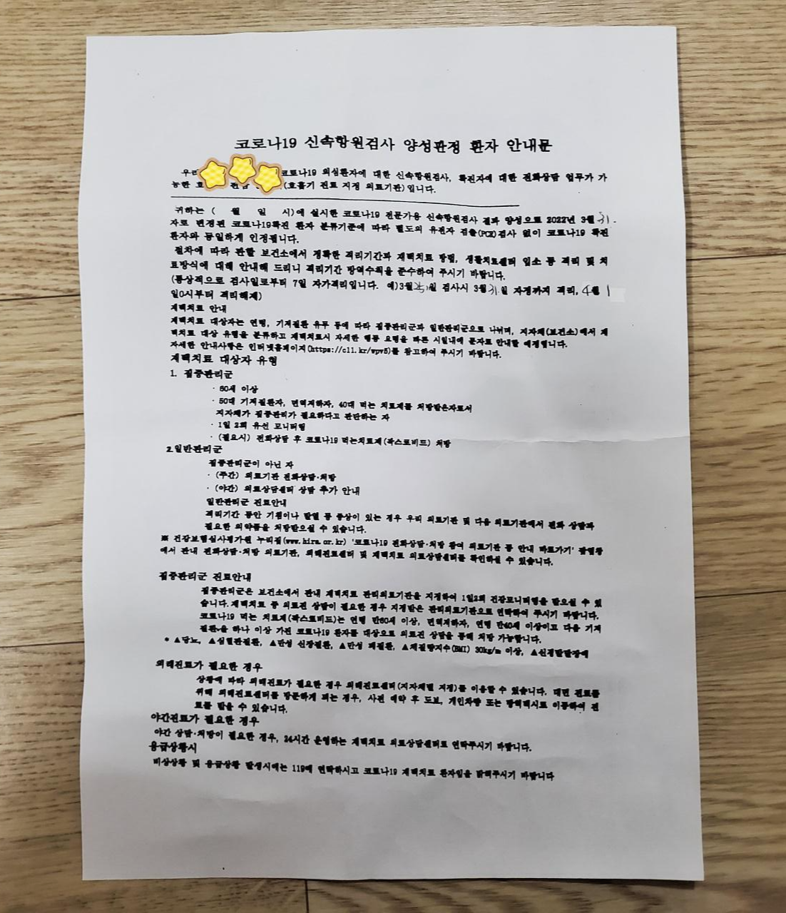 조금 앉아서 기다리니 의사 선생님이 내 진단키트를 보여주면서 양성이라고 했다. 병원에서 주는 종이를 받고 약을 받은 후 격리 안내를 받았다. 의사 선생님이 들고 있는 내 진단키트에는 두 줄이 선명했다. 너무 슬프다.