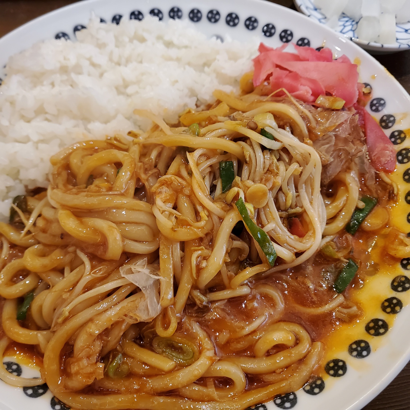 점심은 돈까스 집에서 야끼소바를 주문해서 먹었고, 가쓰오부시와 우동과 소스의 조합이 잘 어울려 한 그릇을 맛있게 비웠다. 먹을 때는 야끼소바의 국물이 튀었는지 전혀 알지 못하고 오후 시간을 보냈다.