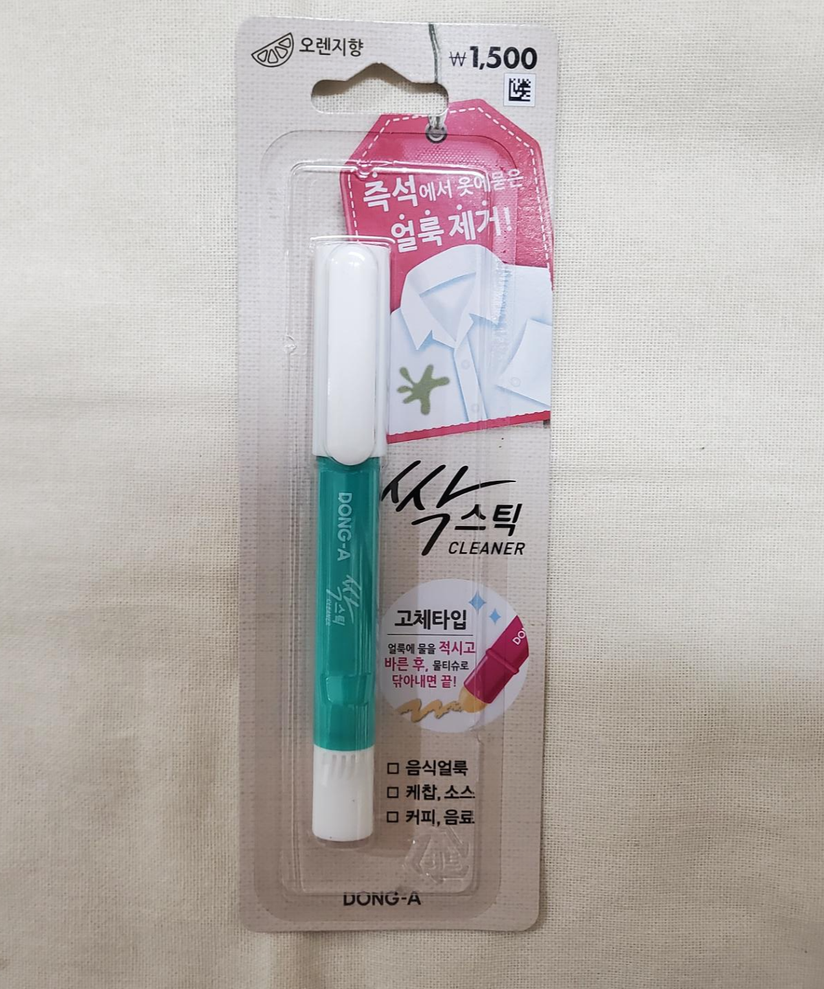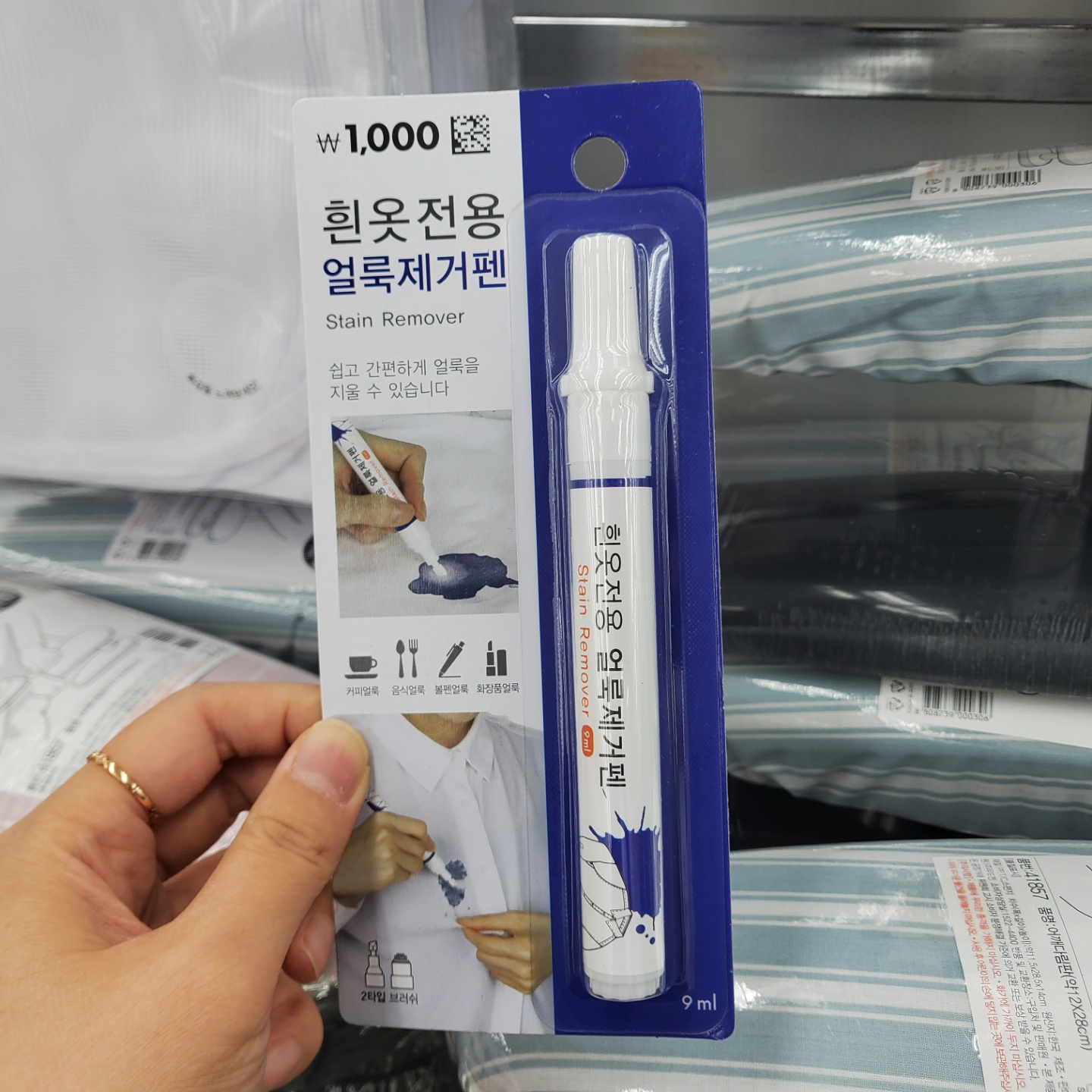흰옷 전용 얼룩제거펜도 있었는데 흰 옷에만 사용하는 제거 펜이라고 한다. 얼룩진 곳의 밑부분에 깨끗한 종이 타월을 깔아놓고 펜 끝을 눌러서 용액이 나오게 해 사용하는 방식이라고 한다.