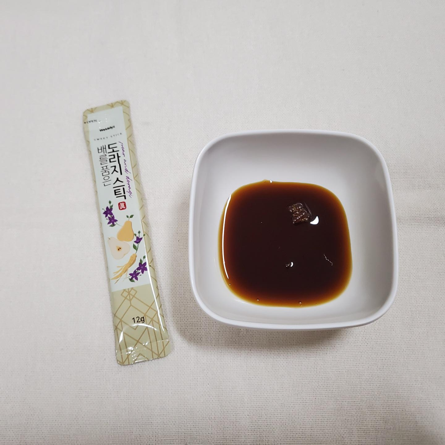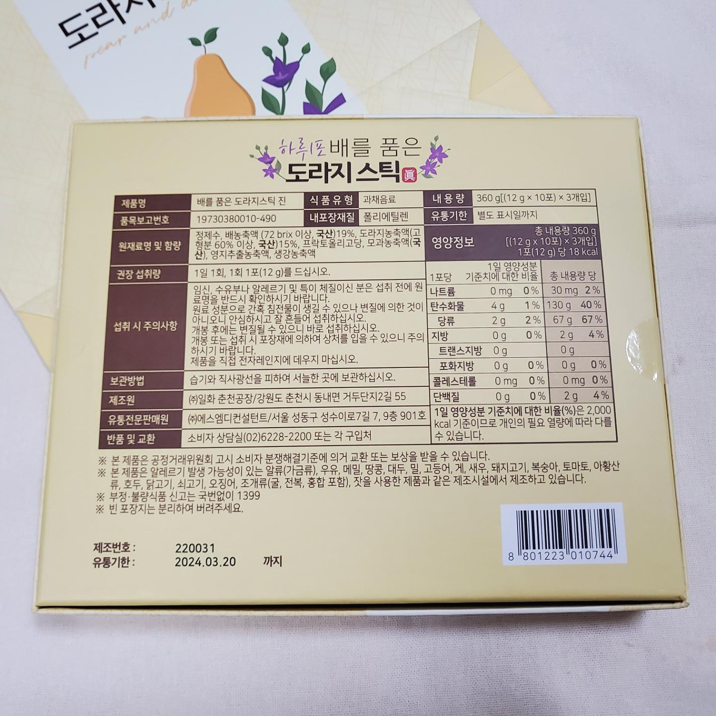 배 농축액이 72 brix , 도라지 농축액이 60% 이상으로 배와 도라지의 비율을 잘 배합해 쓴맛은 줄이고 먹기 좋게 단맛을 더 높인 제품인 것 같다. 용량은 12g으로 이지컷 처리가 되어 있어 간편하게 뜯어 가지고 다니면서 어떤 장소에서든 편하게 먹을 수 있게 쭉 짜 먹으면 된다. 1일 1회 1포를 섭취하면 된다.