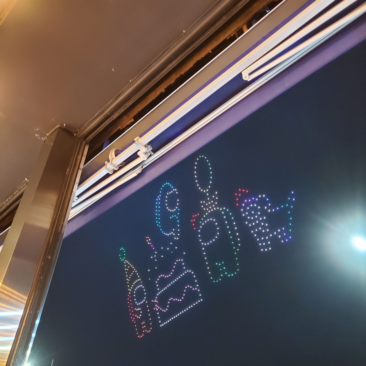 갑자기 사람들이 먹다가 자리에서 일어나서 와! 와! 해서 보니 드론쇼를 하고 있었어요. 저희도 가게앞에서 잠시나마 드론쇼를 즐기고 다시 자리로 돌아왔답니다.