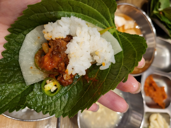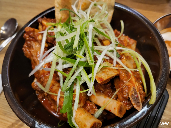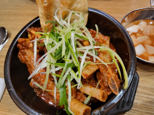 돼지갈비찜의 메인은 고기인데 고기의 누린내가 심해서 고기 자체만을 즐기지 못했고 그 냄새를 조금이라도 잡아줄 쌈무나 깻잎, 고추, 마늘을 넣어 함께 먹을 수밖에 없었던 점이 아쉬움으로 남는다.